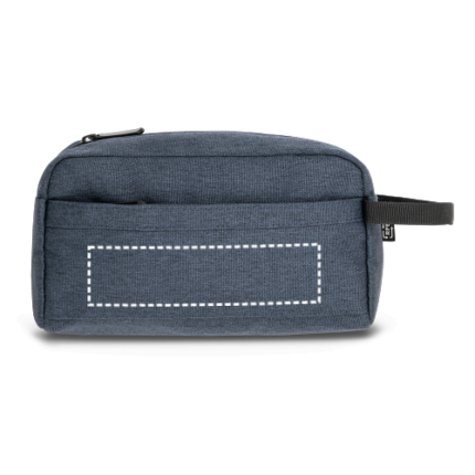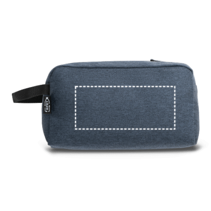 600D rPET cosmetic bag with lined interior. Front zipper pocket and side webbing handle. 220 x 120 x 110 mm