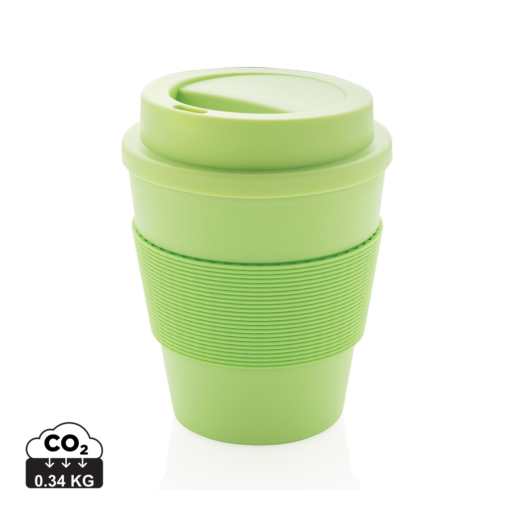 Stop single use! Bring your own cup and join the reuse revolution so you can contribute to a disposable free world. These lightweight and durable cups are perfectly suited to take your coffee on the go. These cups are reusable and made of 100% recyclable friendly PP material. The cups have a screw lid and a silicone sleeve. 100 degree Celsius food safe approved. Dishwasher and microwave safe. Content: 350ml.