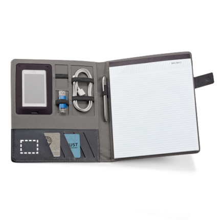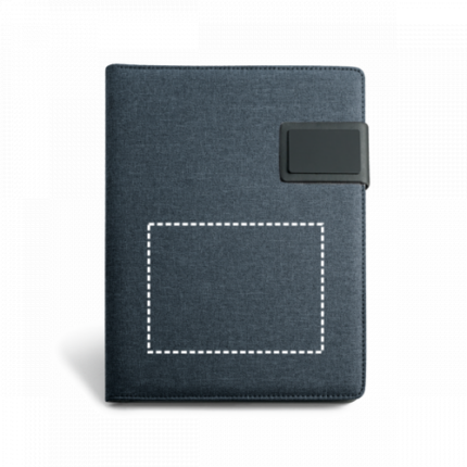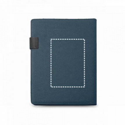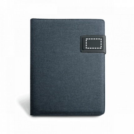 A4 imitation linen and imitation leather. Features a magnetic closure with customizable plate, a 20 sheet pad of lined paper, pen holder (pen not included), smartphone pocket and brackets for cables or other accessories (not included). 233 x 310 x 18 mm | Plate: 50 x 30 mm