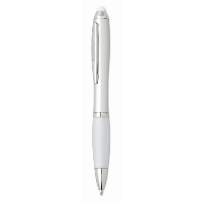 Twist action ball pen in ABS with stylus soft grip and matching tip. Blue ink