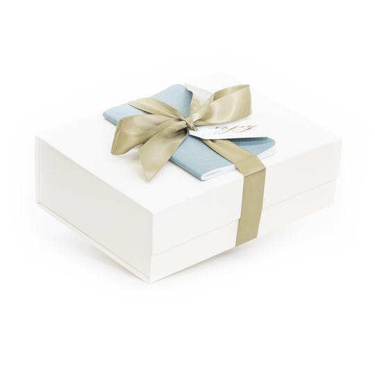 Ένα Rise & Grind Welcome kit δώρου με μπλε κορδέλα που είναι ιδ.