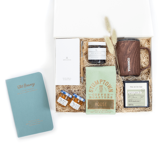 Ένα δώρο Rise & Grind Welcome kit, συσκευασμένο σε κουτί με καφέ, τσάι.