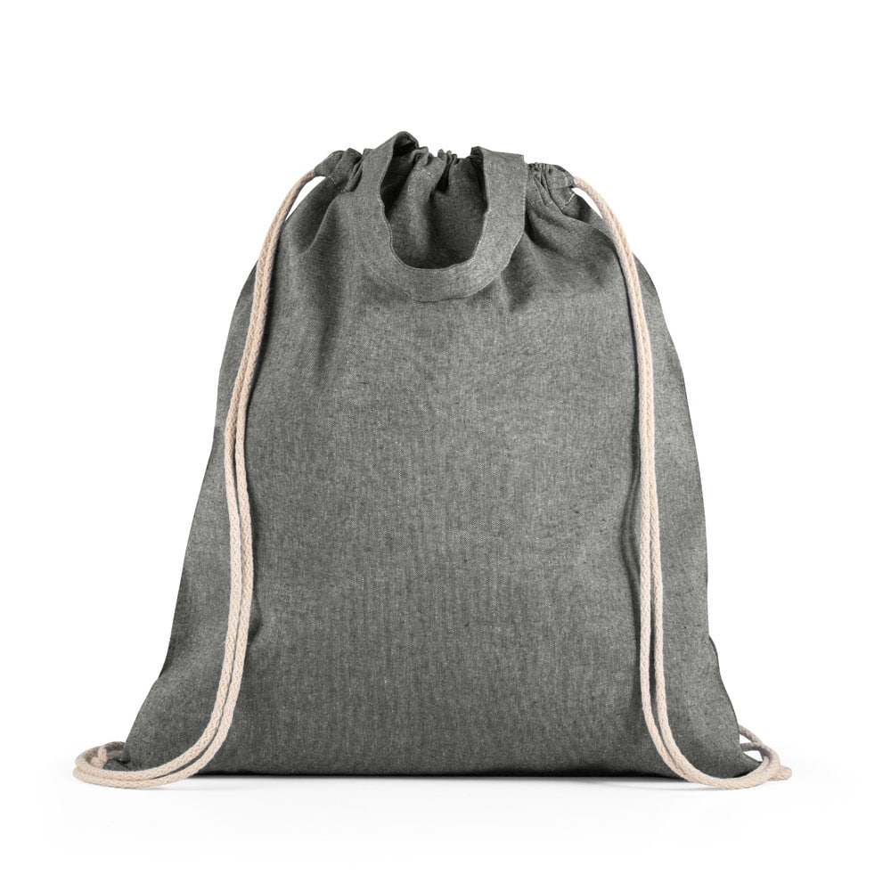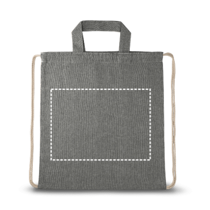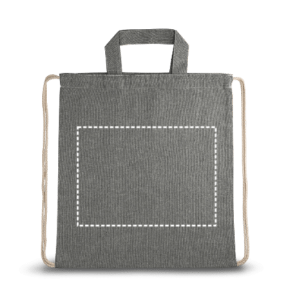Drawstring bag with recycled cotton (140 g/m²), 30 cm handles and cotton cords for closure. 370 x 410 mm
