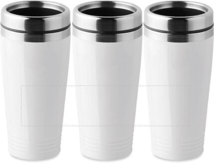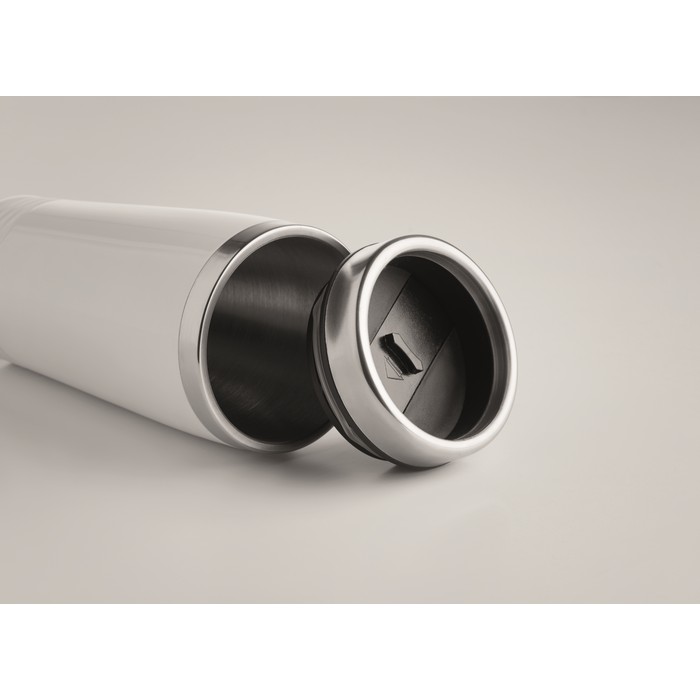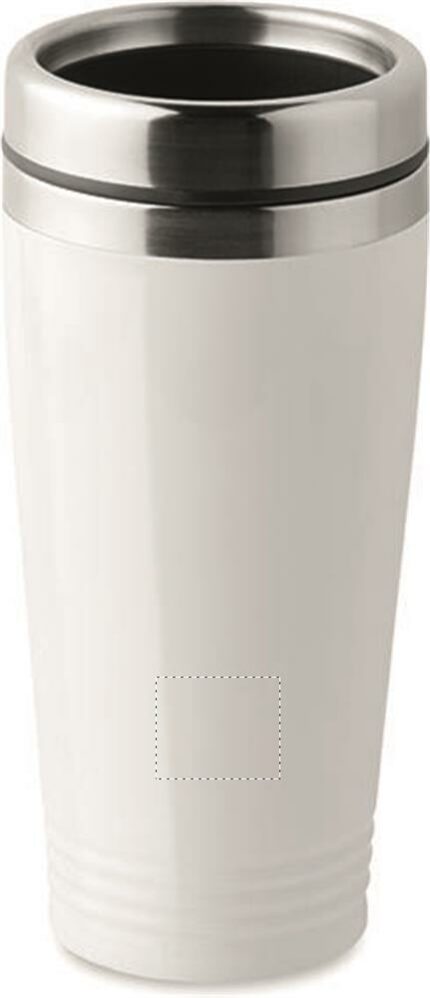 Double wall stainless steel travel cup with black PP lid. Capacity: 400 ml.