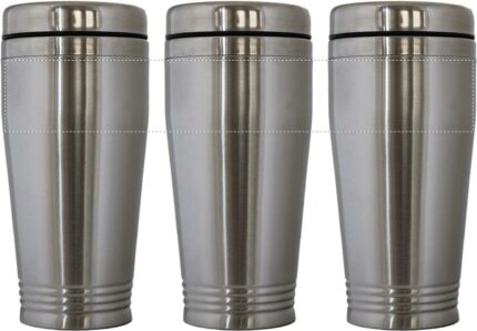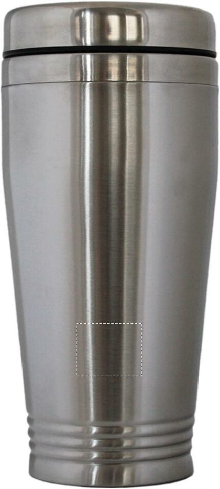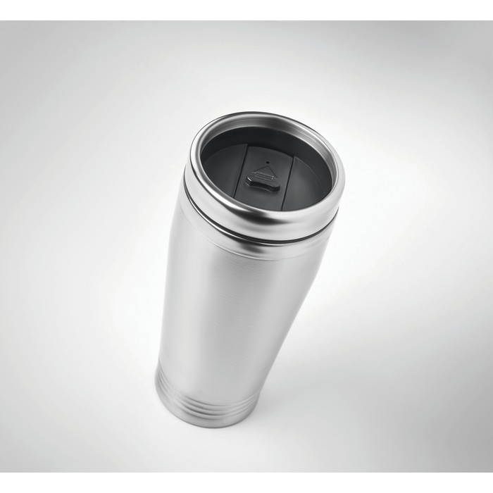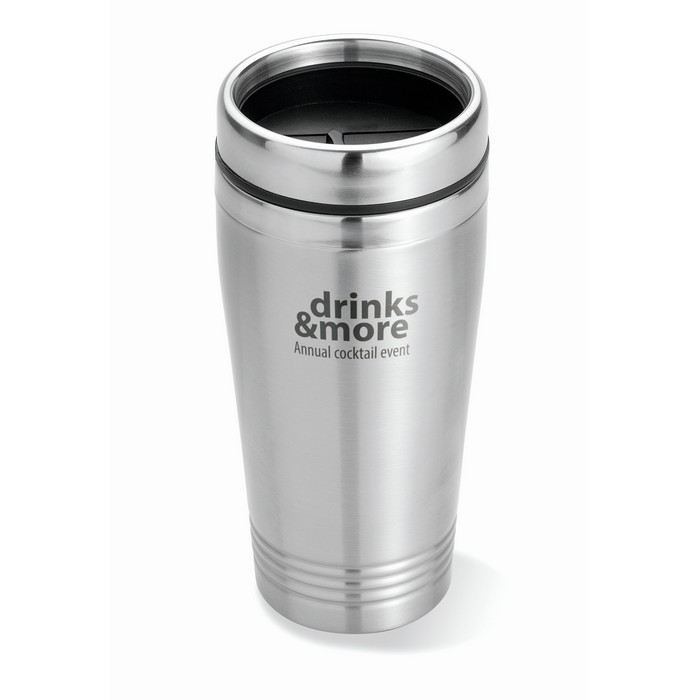 Double wall stainless steel travel cup with black PP lid. Capacity: 400 ml.