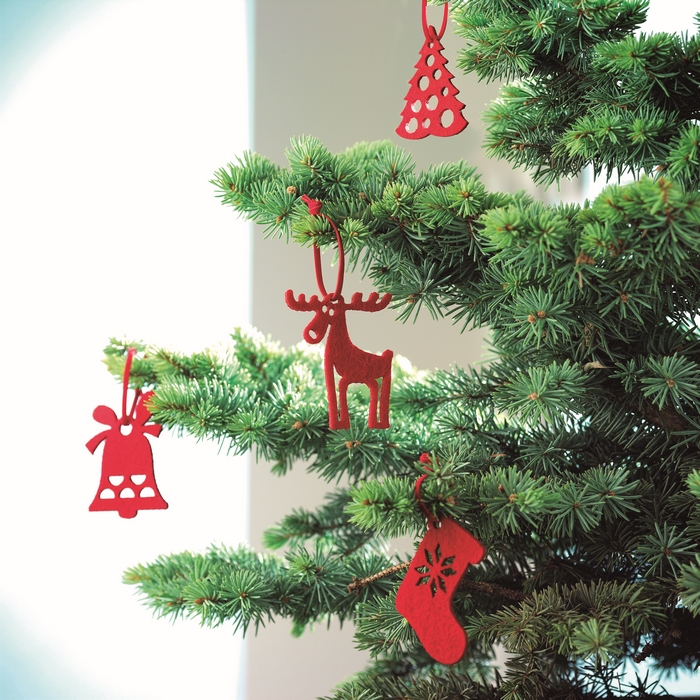 Set of 6 red felt tree hangers in 6 different designs: tree, snowflake, bell, boot, poinsettia and reindeer.