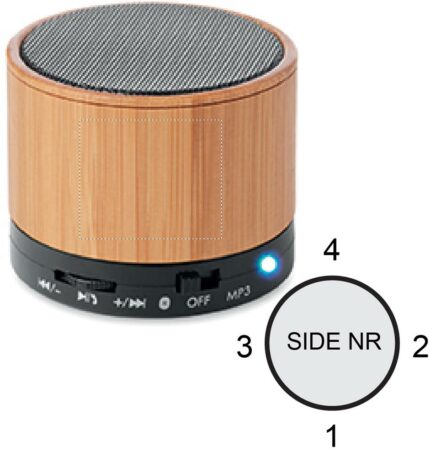 4.2 wireless speaker in ABS with bamboo casing and LED light indication. 1 Rechargeable Lithium 450 mAh battery included. Includes a SD card port and an AUX/ USB cable. Hands free call function. Output data: 3W, 3 Ohm and 5V. Playing time aprox. 3h. Bamboo is a natural product, there may be slight variations in colour and size per item, which can affect the final decoration outcome.