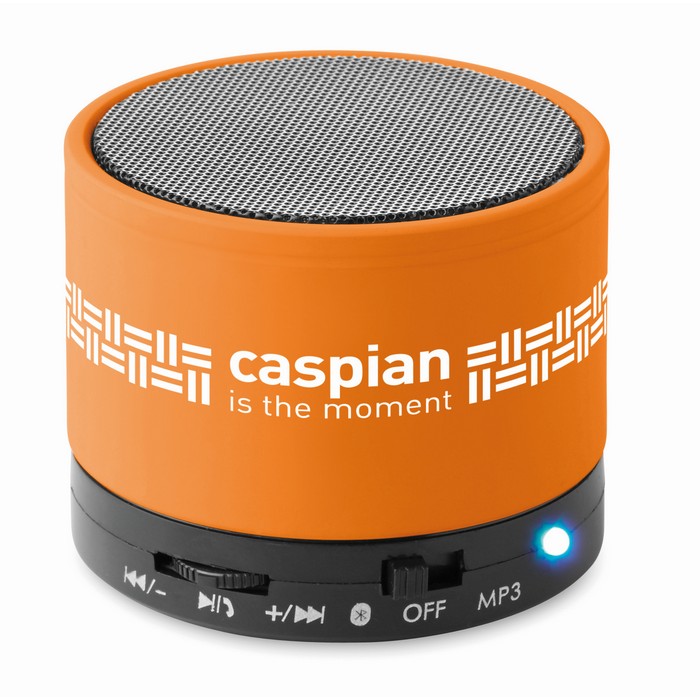 4.2 wireless speaker in ABS with rubber finish and LED light indication. 1 Rechargeable Lithium 450 mAh battery included. Includes an SD card port and an AUX / USB cable. Hands free call function. Output data: 3W, 3 Ohm and 5V. Playing time approx. 3h.