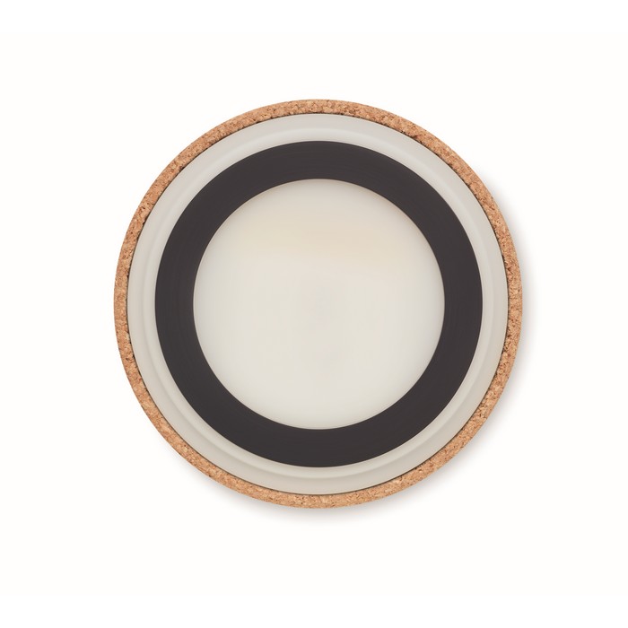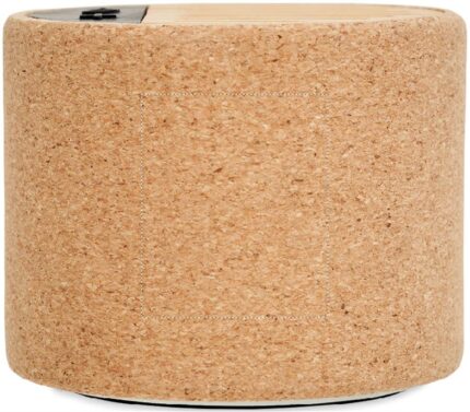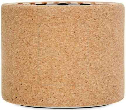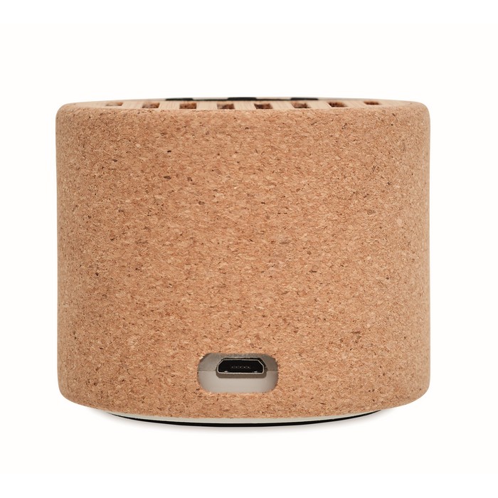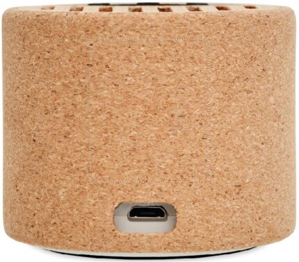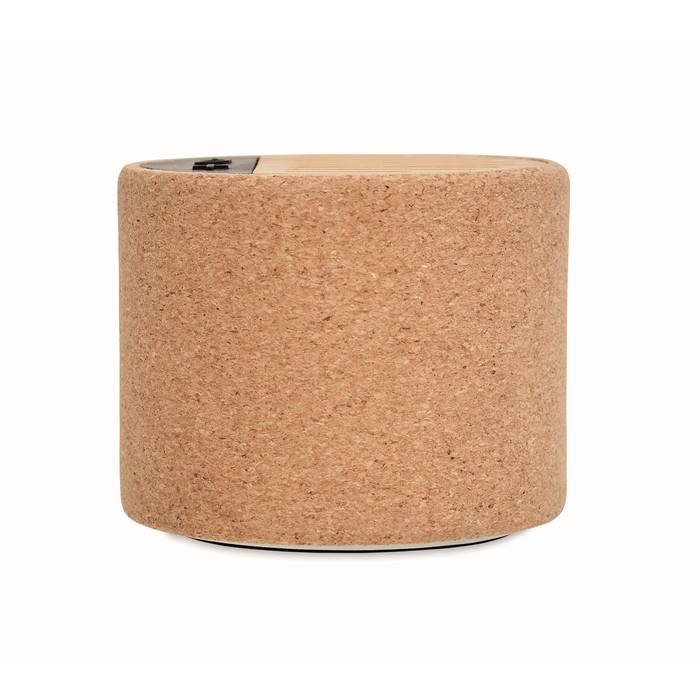 5.3 wireless speaker in ABS with cork casing with bamboo on top and LED light indication. 1 Rechargeable Lithium 300 mAh battery included. Output data: 3W, 4 Ohm and 5V. Playing time approx.. 4h.