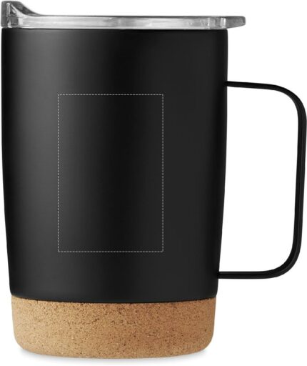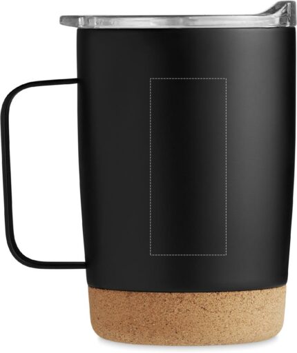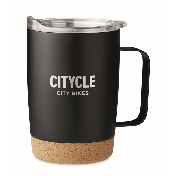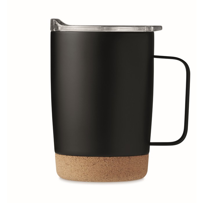 Double wall stainless steel tumbler with cork base and sliding sip hole cover. Capacity: 300 ml.