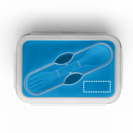 Retractable hermetic box in silicone and PP with a compartment with capacity up to 640 mL. On top of the lid there is a space to store one piece of tableware (included), with a 2 in 1 function, fork and spoon. The box is suitable for microwave use, with the lid having to be removed. 170 x 110 x 66 mm | Folded: 170 x 110 x 40 mm