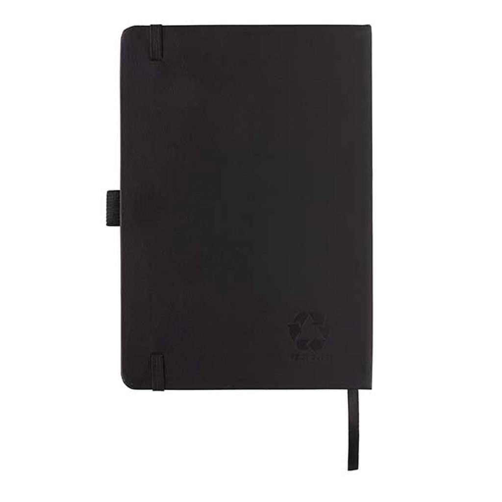Jot down your thoughts and creative inspirations in this elegant A5 RCS certified recycled bonded leather hardcover notebook. Its stylish design boasts a beautiful finish, making it a sophisticated choice for your writing needs. The notebook is equipped with 80 sheets/160 pages of high-quality 70 gm/s white colored lined RCS certified recycled paper. It also features a vertical elastic band and a convenient pen loop, adding to its practicality and charm. Total recycled content: 67% based on total item weight.
