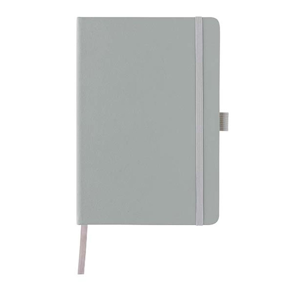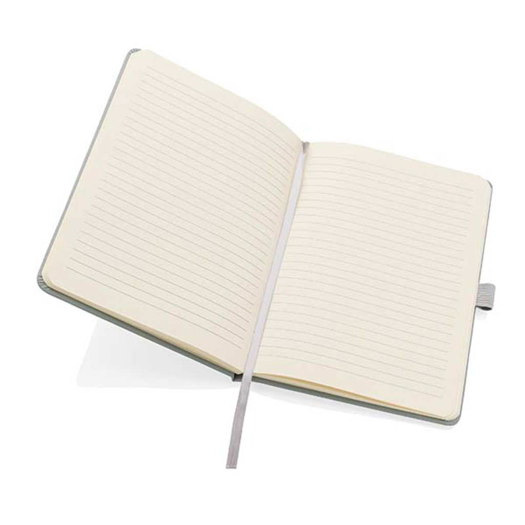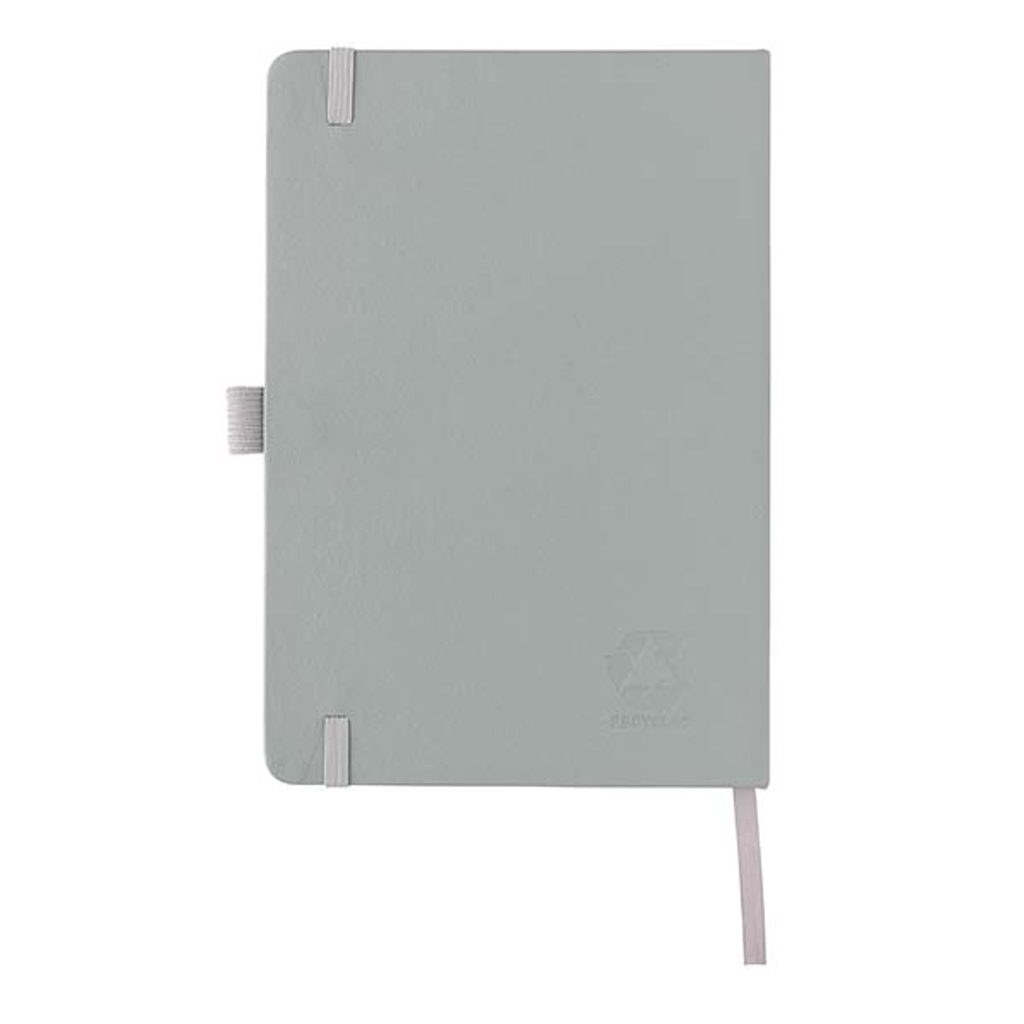 Jot down your thoughts and creative inspirations in this elegant A5 RCS certified recycled bonded leather hardcover notebook. Its stylish design boasts a beautiful finish, making it a sophisticated choice for your writing needs. The notebook is equipped with 80 sheets/160 pages of high-quality 70 gm/s white colored lined RCS certified recycled paper. It also features a vertical elastic band and a convenient pen loop, adding to its practicality and charm. Total recycled content: 67% based on total item weight.