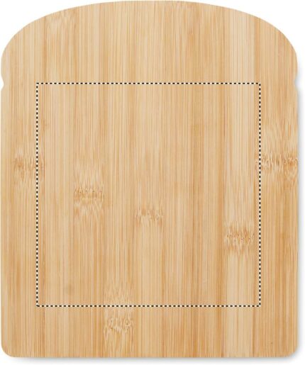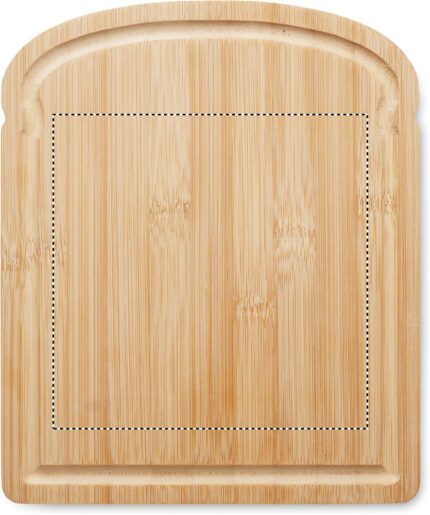 Bread-shaped cutting board in bamboo with groove around the edge.