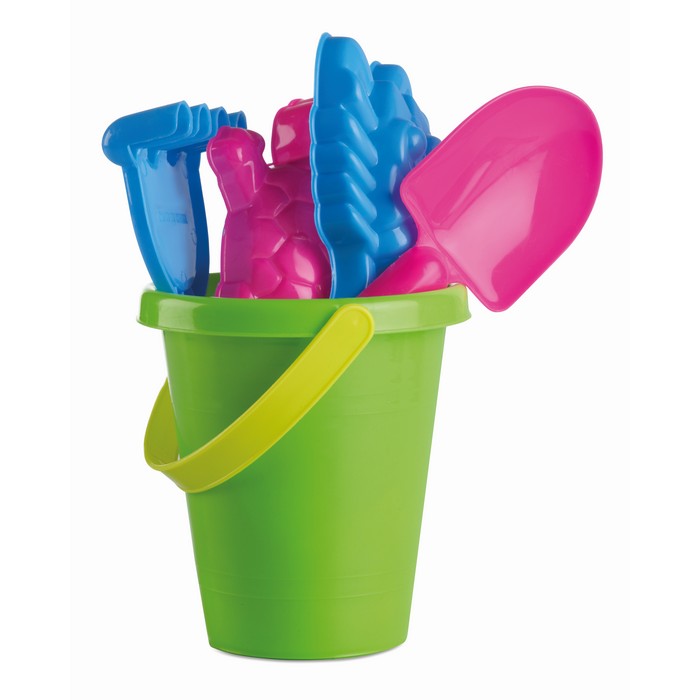 Children sand game composed of a bucket, a shovel, a rake and 2 moulds to make nice sand models. All made in shiny PP.