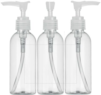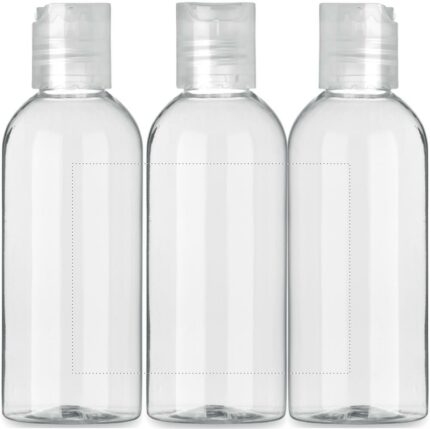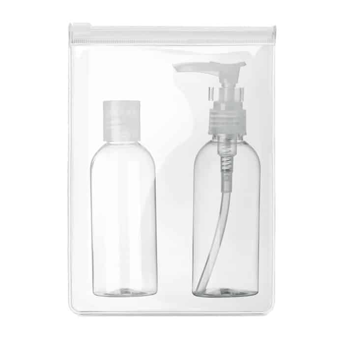 Bottle kit in a PEVA pouch. These bottles can be filled with hand sanitizer, soap or other liquids to keep you safe and clean. One bottle has a flip cap that is easy to use with gel type liquids. The other bottle has a pump, which is ideal for other liquids. Both bottles are made from PET plastic. Bottles are supplied empty. Capacity of 100ml each.