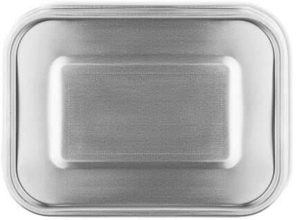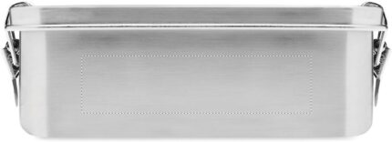 Stainless Steel lunch box with strong and secure side buckles. Including inner divider. Capacity: 1200 ml.