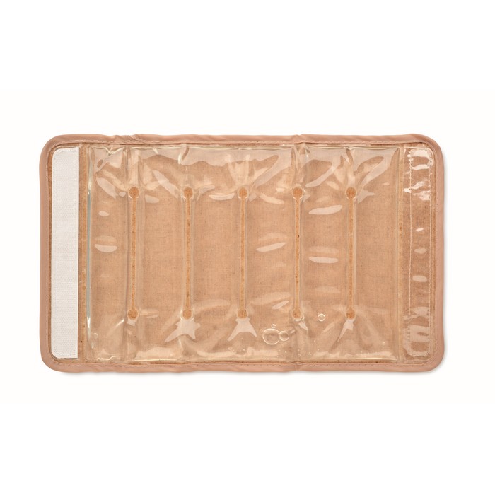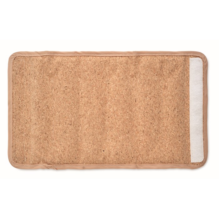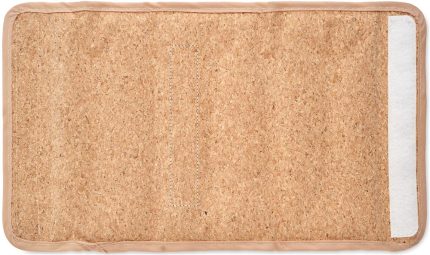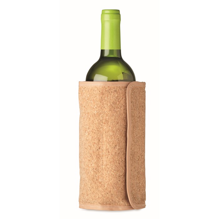 Soft wine cooler in cork wrap with PVC sheeting with gel inside. It has an adjustable hook and loop fastening.