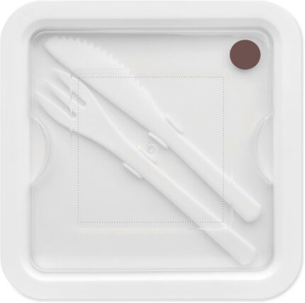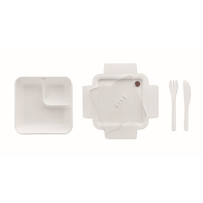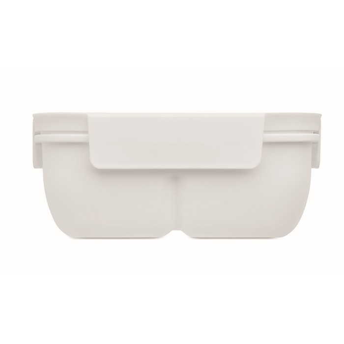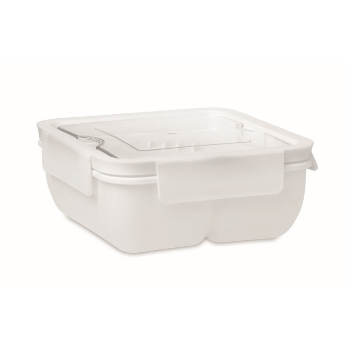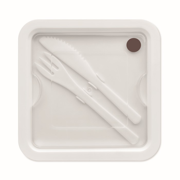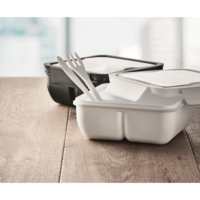 Lunch box in PP with 2 compartments. Includes PP cutlery set in the lid. Capacity: 600 ml.