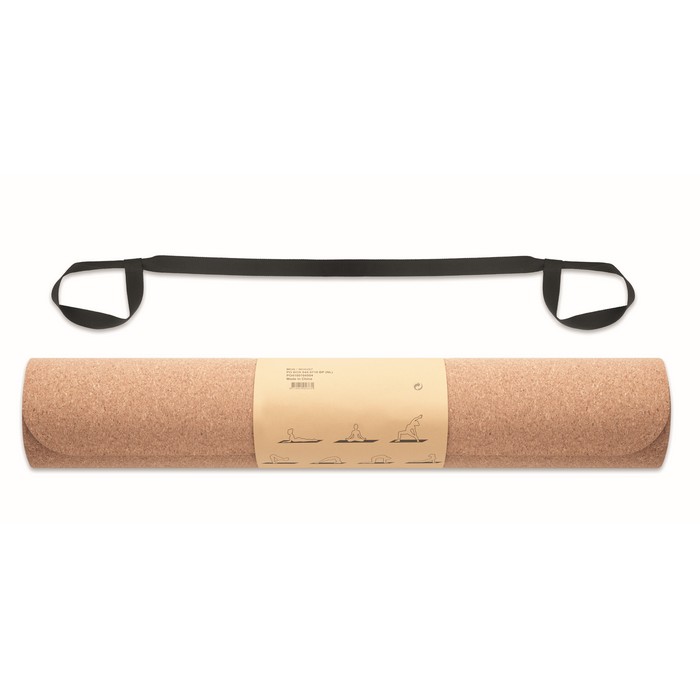 Yoga exercise mat made of cork and TPE material presented with paper wrap with instructions. Thickness 0,4cm. Including a cotton exercise rope/strap holder.