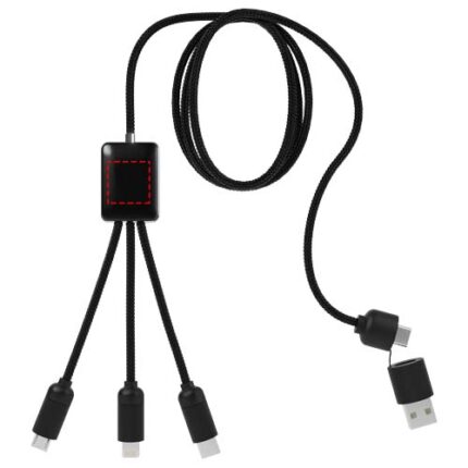 Charging cable with rubber and metal finish and light-up logo. Fitted with three connectors (Type-C, Android, iPhone) and USB-A and USB-C output. Up to three devices can be charged simultaneously. Length of cables (including plugs): 10 cm. Total cable length: 1 metre. The cable is made from recycled PET plastic, and the packing from recycled paper and recycled plastic.