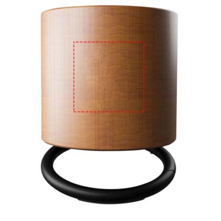 3W maple wood Bluetooth speaker with carved logo and a double sound output for an unparalleled sound quality for a speaker this size. The ring speaker can be tilted to direct the sound in any direction. Has built-in microphone and conference call function. Capacity: 500 mAh – 3.7 V battery. Frequency: 50 Hz – 20 KHz. Sound output: 1 x 3 W. Impedance: 4 Ω. Bluetooth® 5.0. Net weight: 100 grams. Size: ∅ 50 mm x 45 mm. Comes with a gift box with magnetic closure, made out of recycled paper.