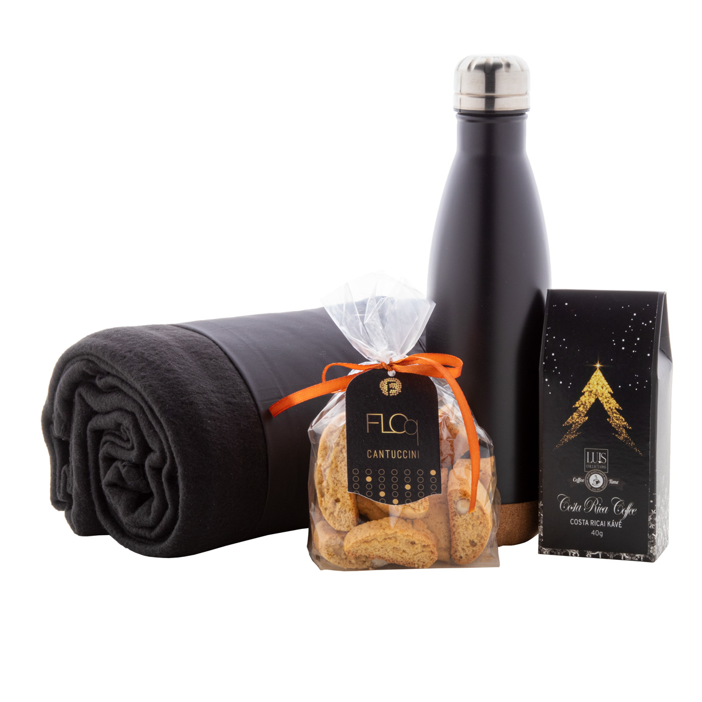 Το Christmas Black Travel Gift Set είναι το τέλειο δώρο για τους λάτρεις του ταξιδιού. Παρουσιάζεται σε ένα όμορφο χαρτόνι kraft με ξύλινο μαλλί και διακοσμημένο με κόκκινη κορδέλα. Περιλαμβάνει μια ζεστή πολική κουβέρτα RPET, ένα δοχείο κενού για τα ροφήματά σας, αρωματικό καφέ Κόστα Ρίκα και γευστικά artisan cantuccini.