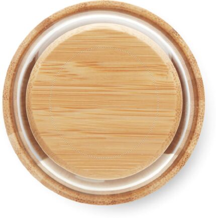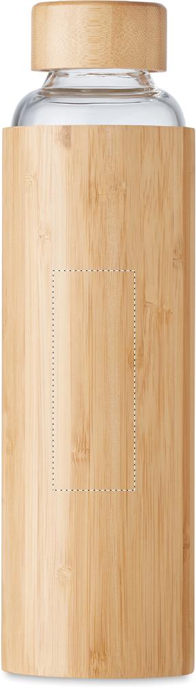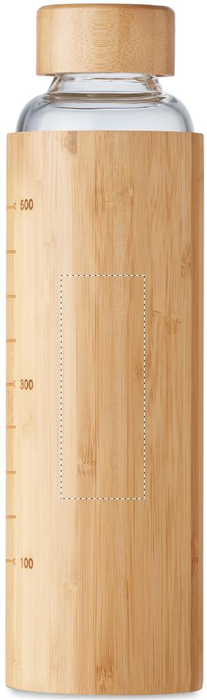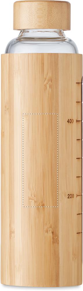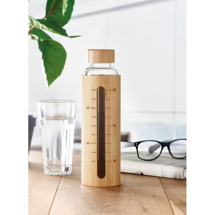 Borosilicate glass bottle with bamboo cover and lid and measurement detail. Capacity: 600 ml.
