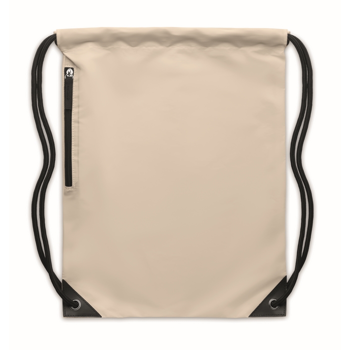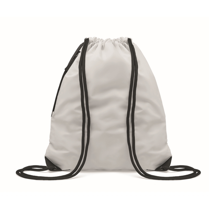 Drawstring bag in 190T polyester coated with with reflective granules. Includes zippered pocket on one side. Thick cord.