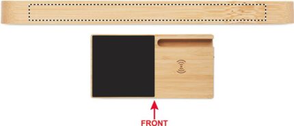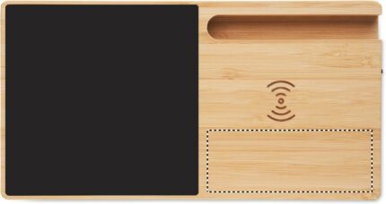 Wireless charger in bamboo including a mug warmer and phone stand. Connect device to your computer, place smartphone on it and allow it to charge. Output: DC 9V/1.67A (15W). Compatible with all QI enabled devices such as latest Androids, iPhone® 8, X and newer.