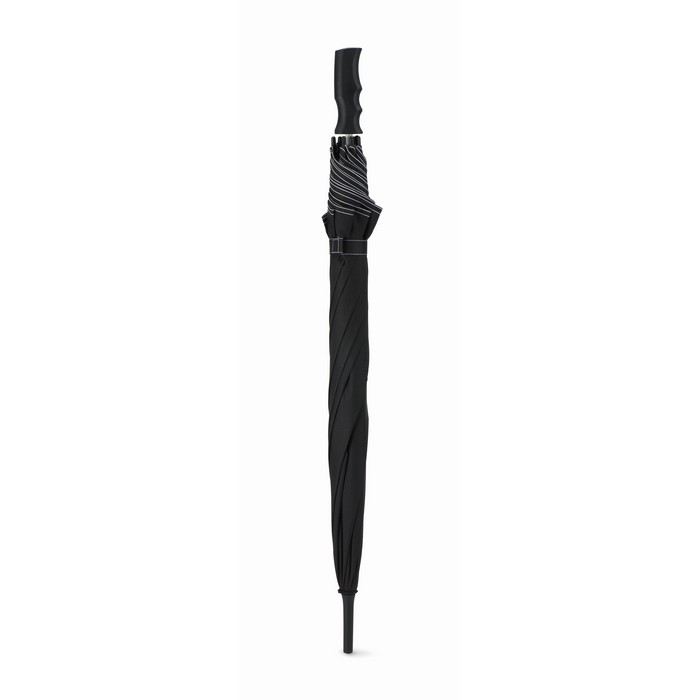 23 inch auto open windproof umbrella in 190T pongee with fiberglass shaft and ribs in colour with black plastic tips. Panels in black with matching colour stitching. Straight black plastic handle. Manual closure.
