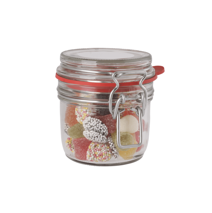 Glass preserving jar 255 ml filled with basic sweets, with full color label on the lid. Choose from: peppermint, marshmallow, licorice, fruit hearts