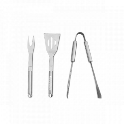 Barbecue set with 3 stainless steel pieces: tong, fork and spatula. Supplied in a non-woven bag with handles. Bag: 405 x 120 x 25 mm