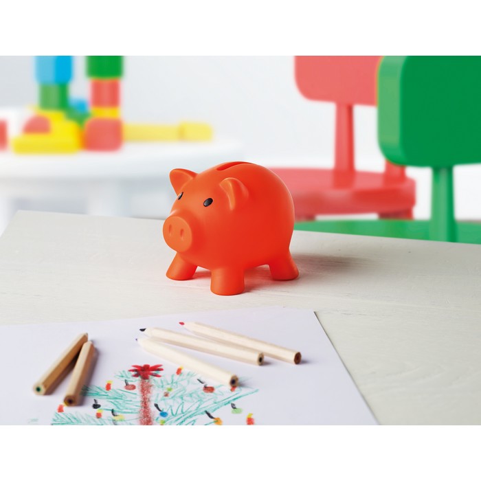 Piggy bank in PVC with ABS stopper on the bottom.