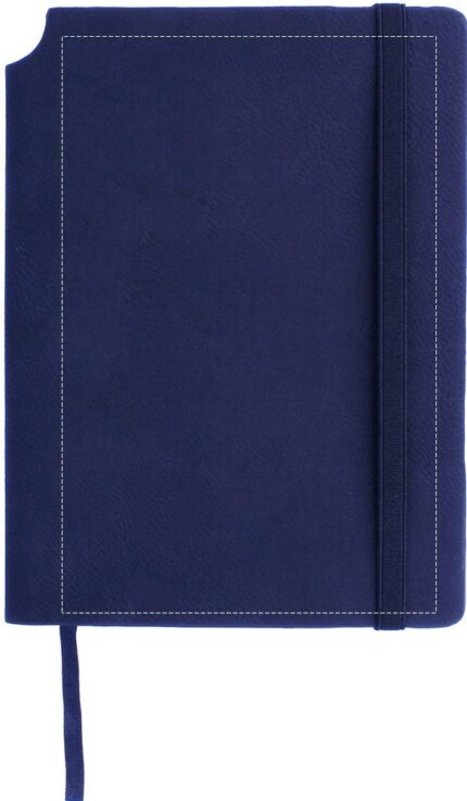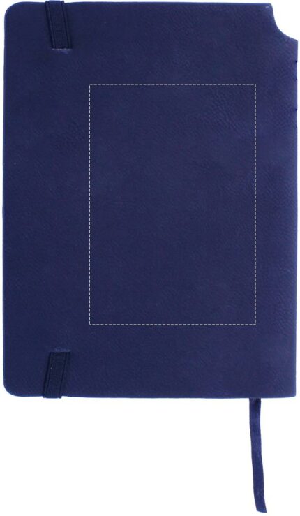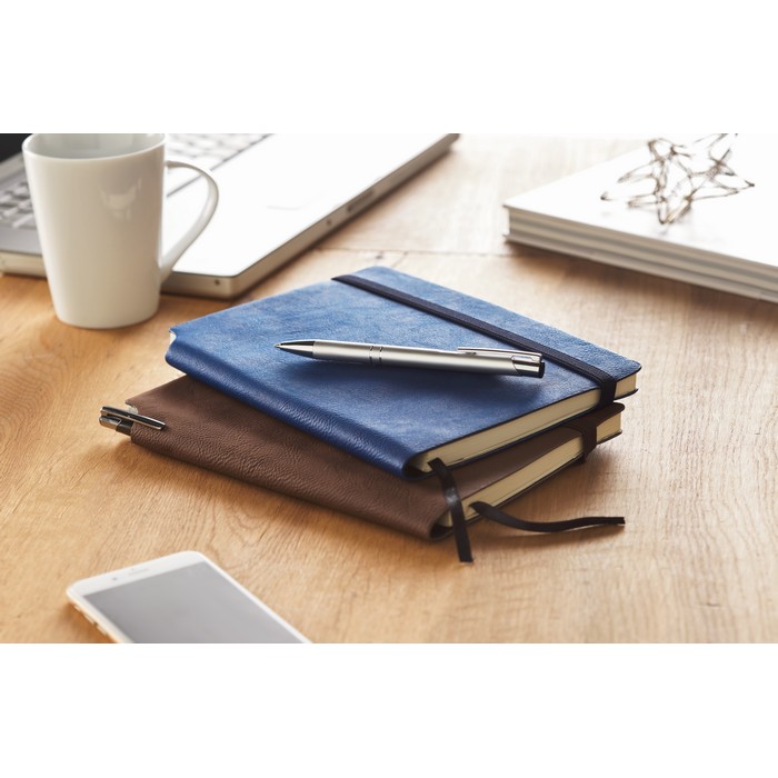 A5 notebook with soft PU cover. Casebound. 160 lined pages (80 sheets). Matching elastic closure strap and ribbon bookmark. Expandable inner pocket in the back. Pen holder in the spine.