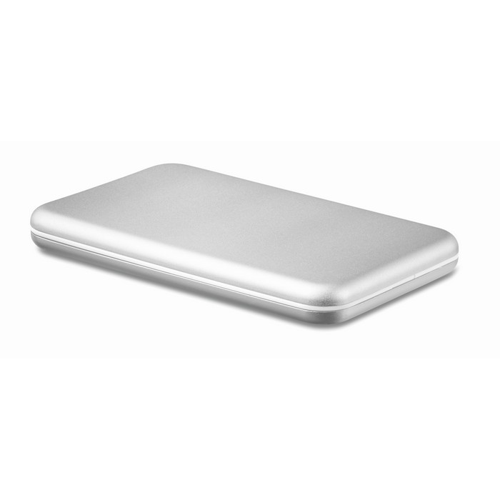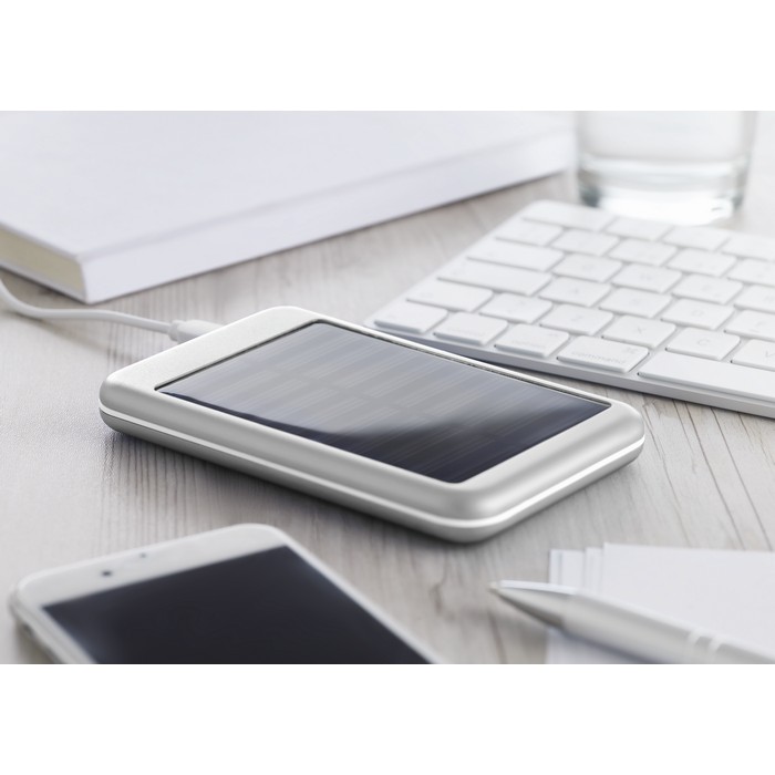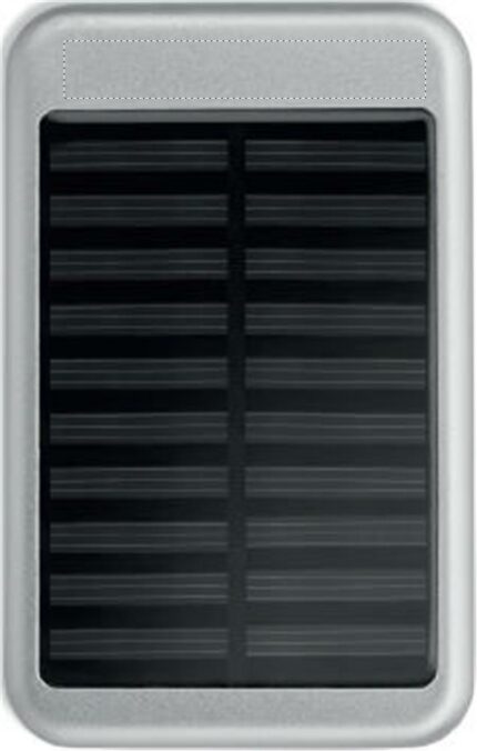 Power bank 4000 mAh in aluminium and solar charging panel. Capacity for smartphone use, output current DC5V/1A. Includes indicating light and USB cable with micro usb plug.