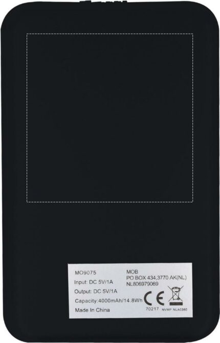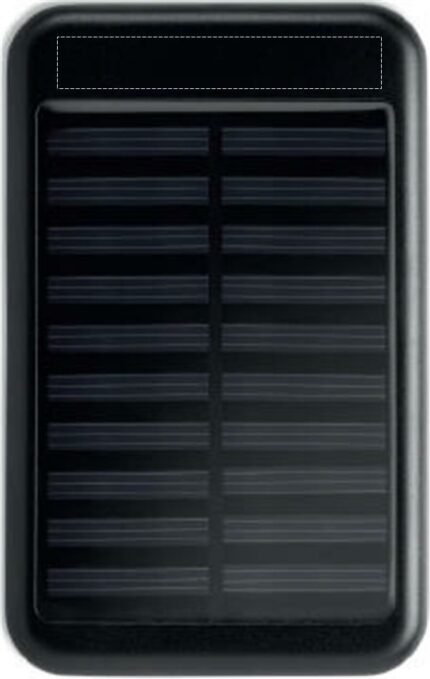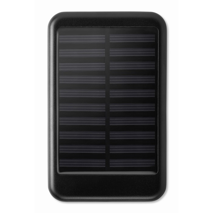 Power bank 4000 mAh in aluminium and solar charging panel. Capacity for smartphone use, output current DC5V/1A. Includes indicating light and USB cable with micro usb plug.