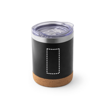 Stainless steel vacuum insulated double walled travel cup with cork base. Contains a transparent lid with sliding closure and matte finish. Capacity up to 400ml. Supplied in a kraft box. Ø93 x 121 mm
