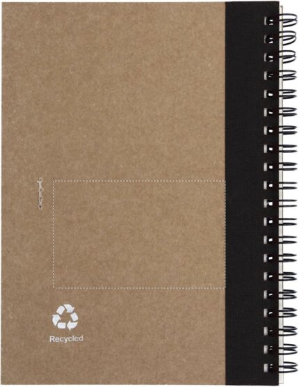 Recycled paper notebook with matching pen. Twin-wire. 140 plain recycled paper pages (70 sheets). Matching push button ball pen in recycled carton and biodegradable plastic. Blue ink. Matching elastic pen holder.