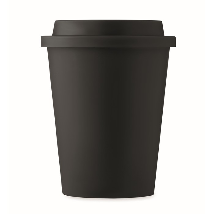 Double wall tumbler in PP with lid. Capacity: 300 ml. Leak free.