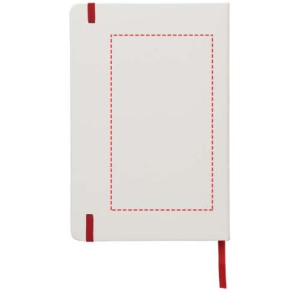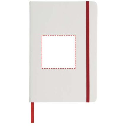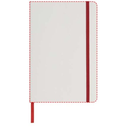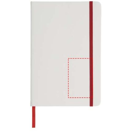 White A5 notebook with coloured elastic closure and ribbon. Includes 80 sheets (60g/m2) lined paper. Digital print possible on cover.