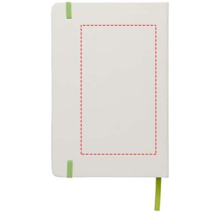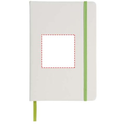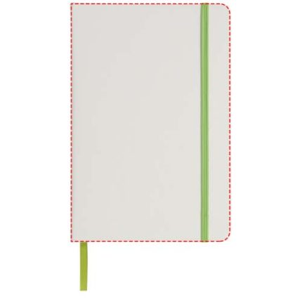 White A5 notebook with coloured elastic closure and ribbon. Includes 80 sheets (60g/m2) lined paper. Digital print possible on cover.