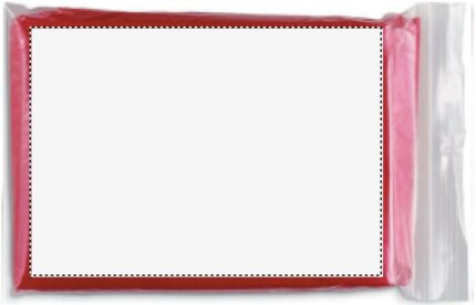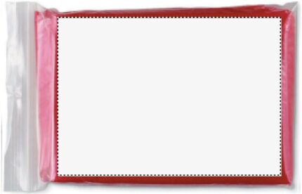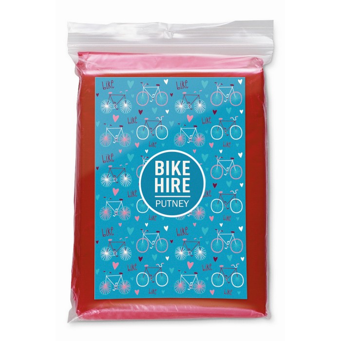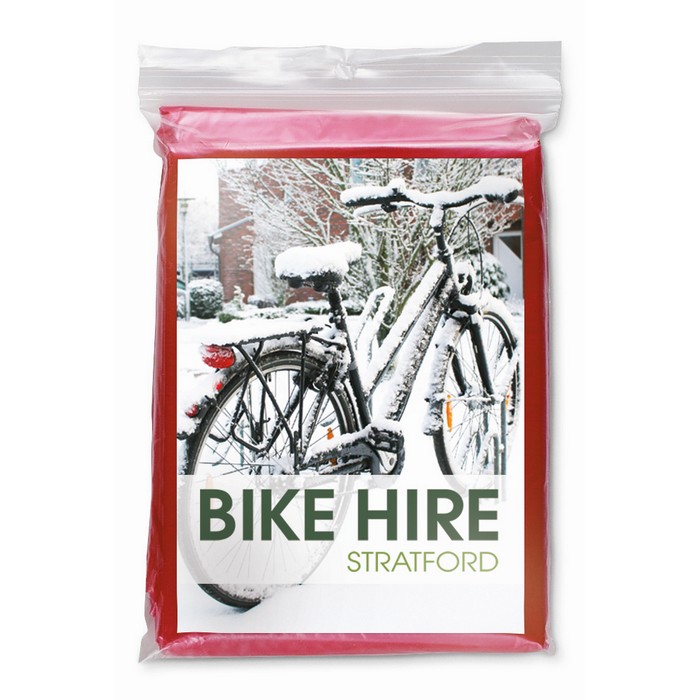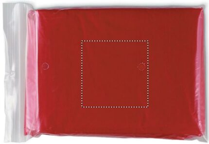 Foldable plastic poncho with attached hood, packed in a transparent polybag.