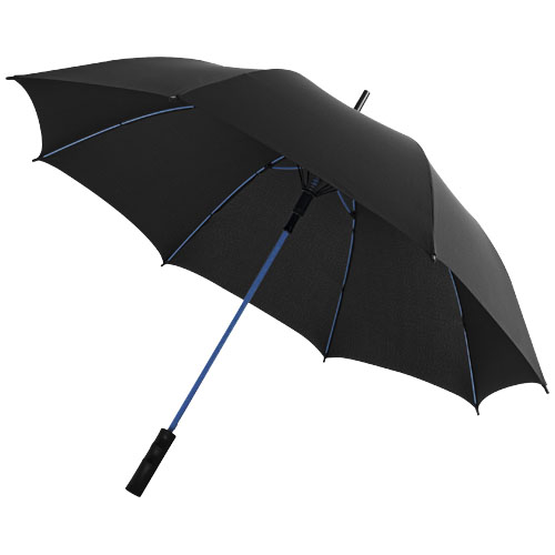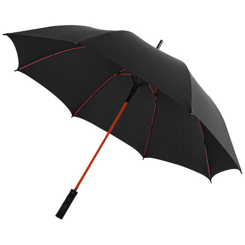 Automatic opening 23″ storm umbrella. Pongee canopy and matching pouch, colour pop fibreglass shaft and fibreglass ribs. Colour matching stitching on umbrella closure strap. Windproof system. Exclusive design.
