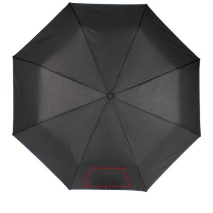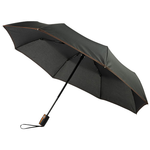 Automatic open and close foldable umbrella with a pongee polyester canopy. Sturdy metal shaft, a high quality frame with fibreglass ribs that offers maximum flexibility in windy conditions. Supplied with a pouch and can easily fit in a handbag or backpack for convenient carrying. Coloured details are available on the soft touch handle and detailed sewing on the canopy and pouch. Large decoration area on each of the panels, as well as the handle.