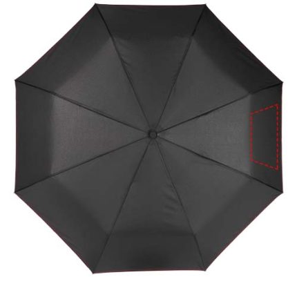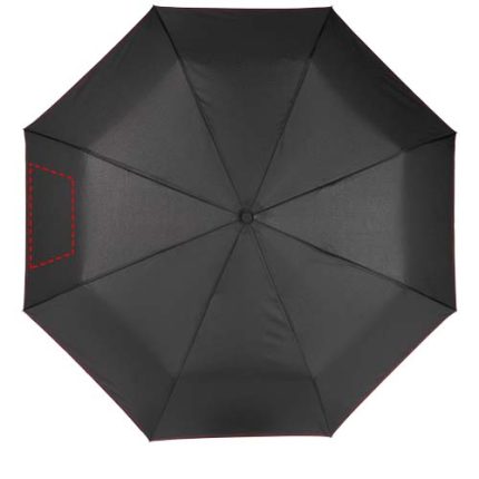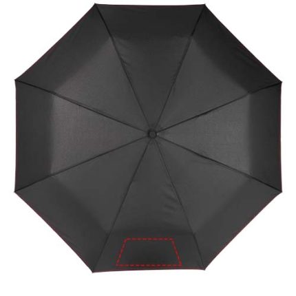 Automatic open and close foldable umbrella with a pongee polyester canopy. Sturdy metal shaft, a high quality frame with fibreglass ribs that offers maximum flexibility in windy conditions. Supplied with a pouch and can easily fit in a handbag or backpack for convenient carrying. Coloured details are available on the soft touch handle and detailed sewing on the canopy and pouch. Large decoration area on each of the panels, as well as the handle.