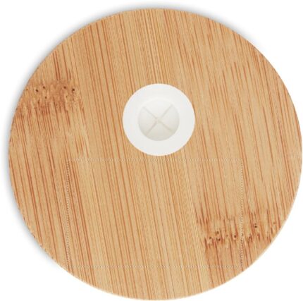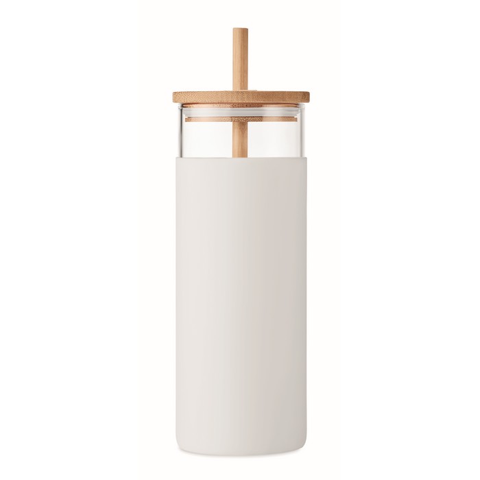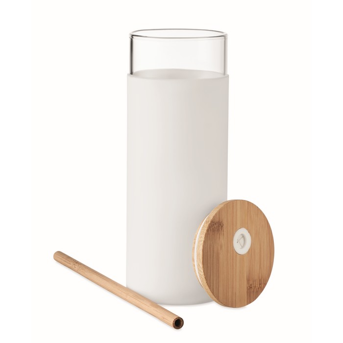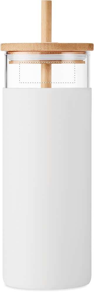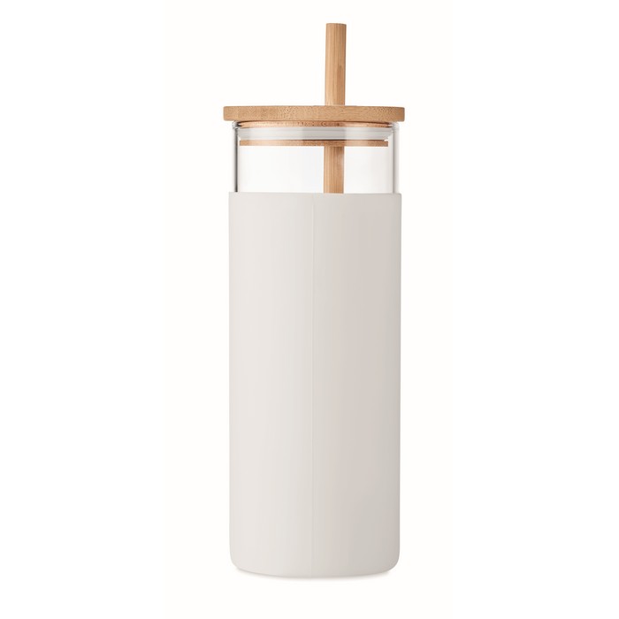 Borosilicate glass tumbler with silicone protective sleeve and with bamboo lid and straw. Capacity: 450ml. As this is a single wall mug heat transfer can still occur.