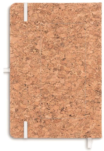 A5 notebook with hard cork cover. Casebound. 192 lined paper (96 sheets). Elastic closure strap, ribbon bookmark and elastic pen holder. Cork is 100% natural material. Due to its structural nature and surface porosity the final print result per item may have deviations.