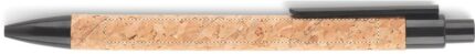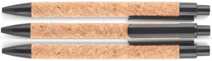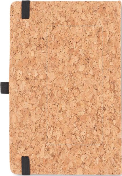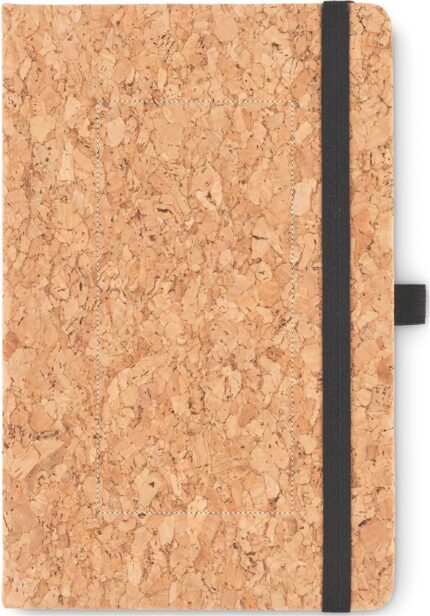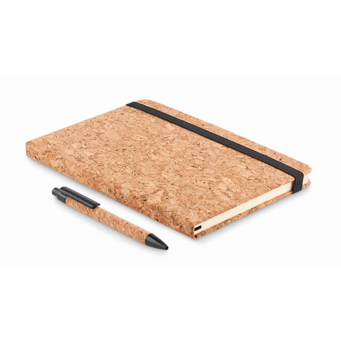A5 cork notebook with matching pen. Hard cork cover. Casebound. 160 lined pages (80 sheets). Elastic closure strap and pen holder. Matching push button ball pen with cork barrel and 50% wheat straw and 50% PP details. Presented in a gift box. Cork is 100% natural material. Due to its structural nature and surface porosity the final print result per item may have deviations.