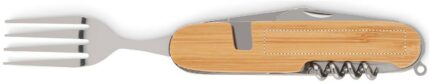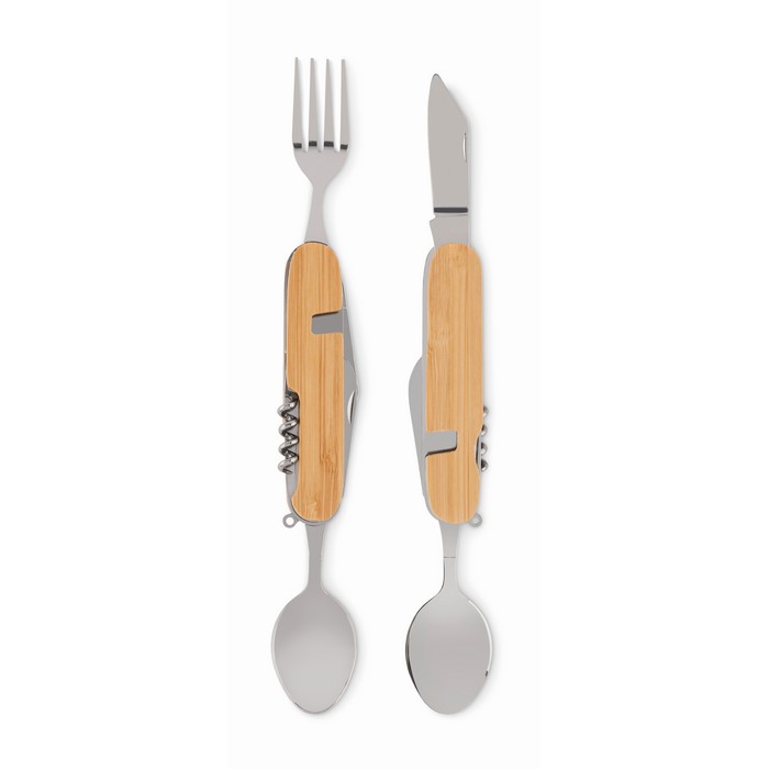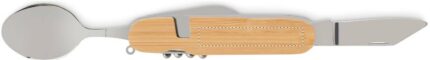 Metal multi-function folding camping cutlery set in wooden casing. 5 functions. Includes fork, spoon, can opener, wine opener and knife. You can separate the pieces in 2.